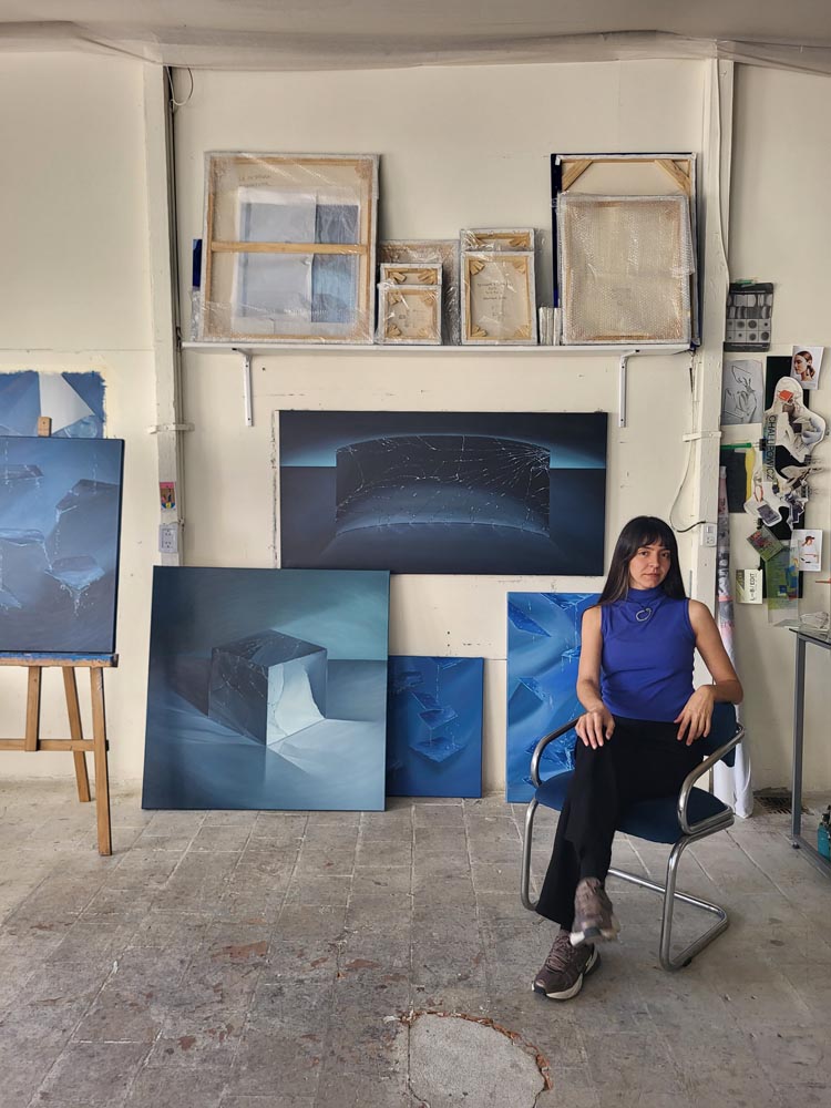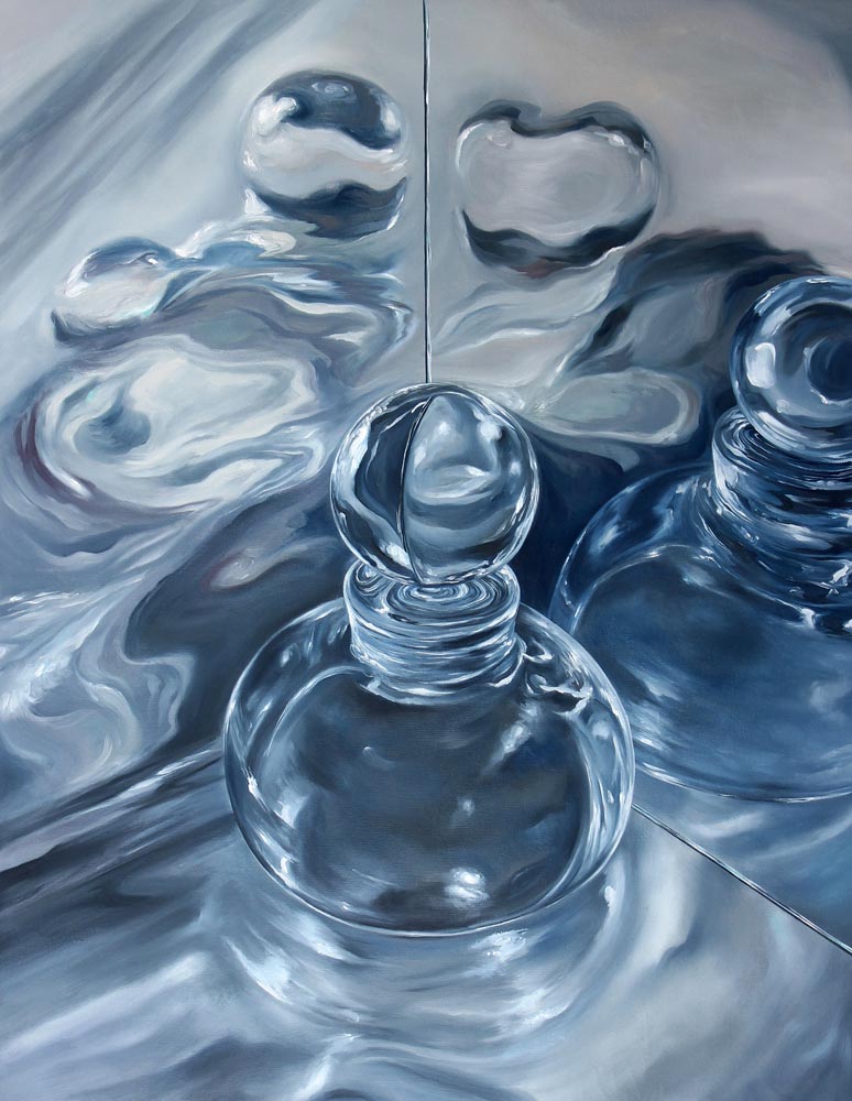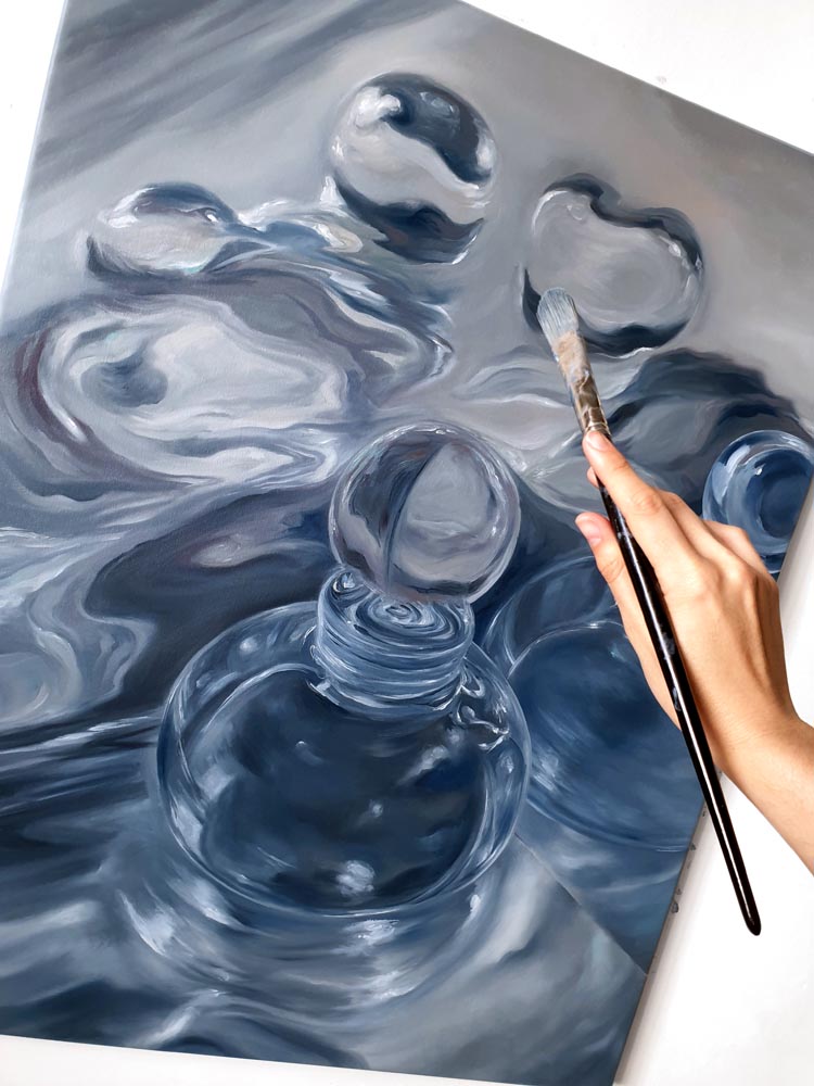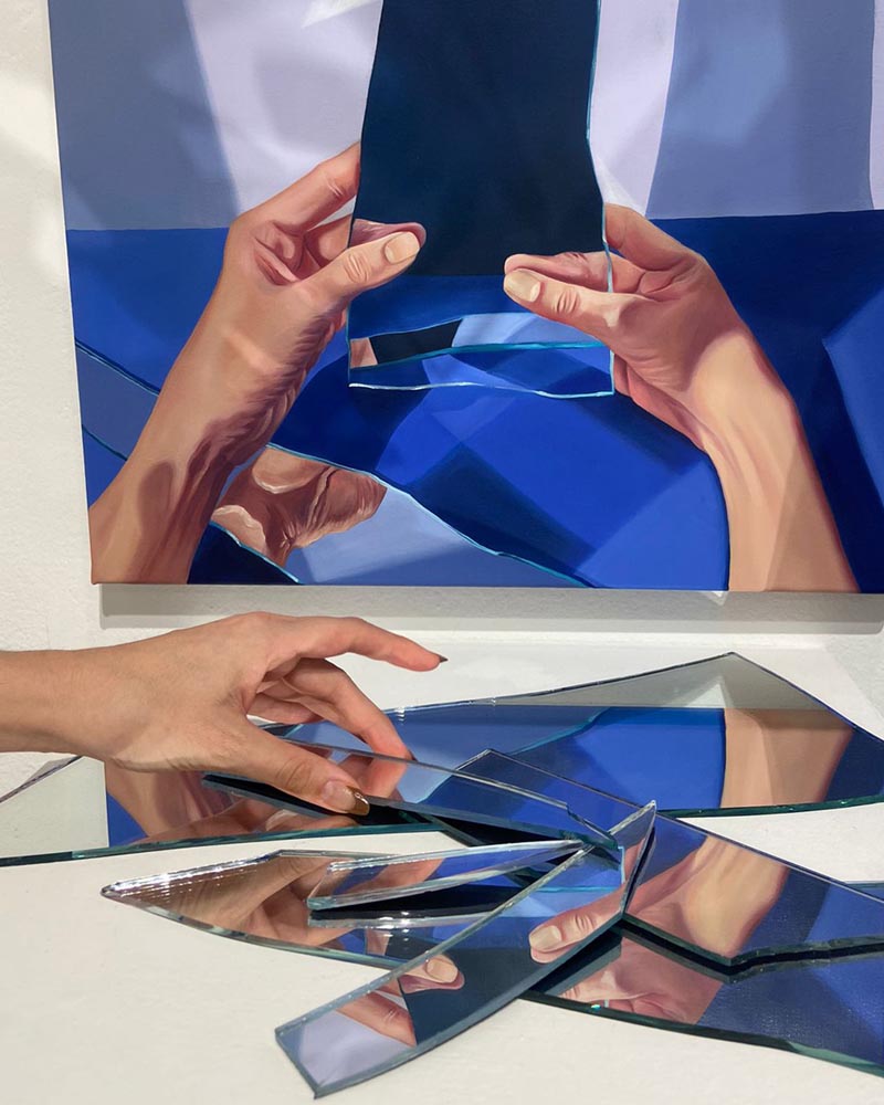 My work begins with photography, since my paintings have a realistic touch and require real references to understand how reflections operate, how images multiply, and how light hits and is projected onto different transparent surfaces, water, and other reflective materials. Using photographs that I take myself, I compose my scenes, which I later translate into the language of painting,