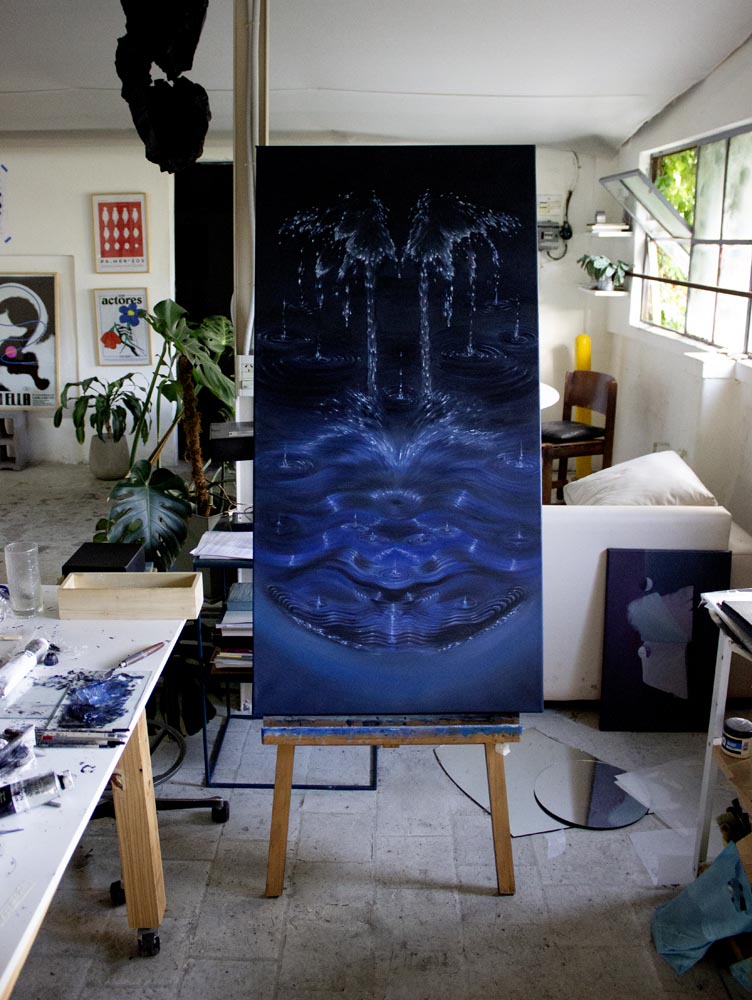 For that, I need to coexist with the paintings, the canvases, my mirrors—everything that is already present, happening, and waiting for that moment when I sit down to work. Once the whole setup is in place, I enter very quickly, and that is what I enjoy the most.