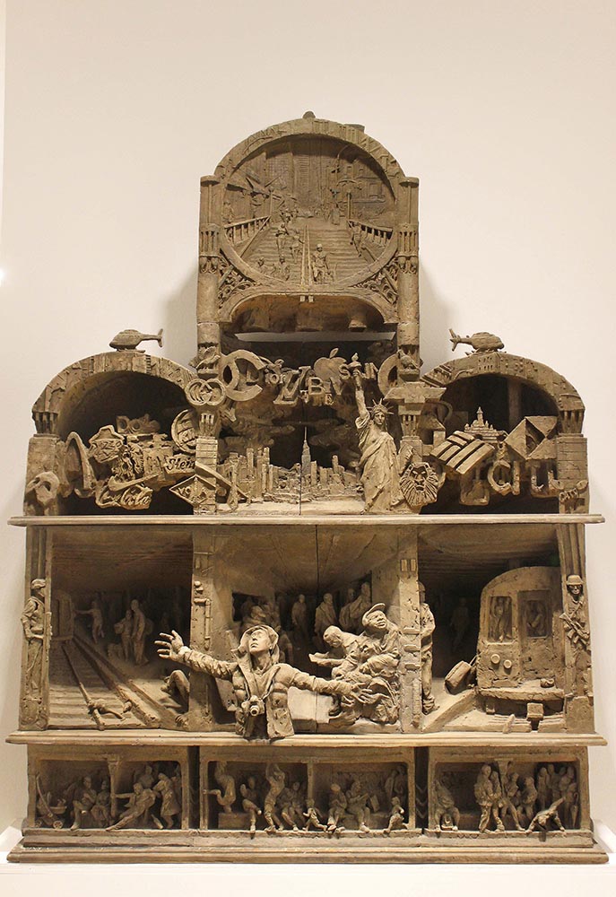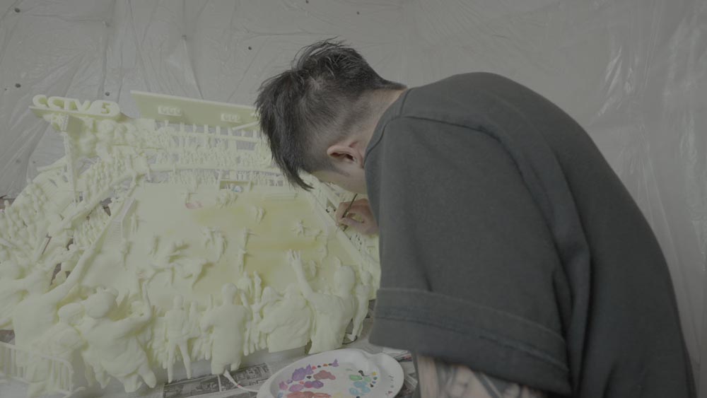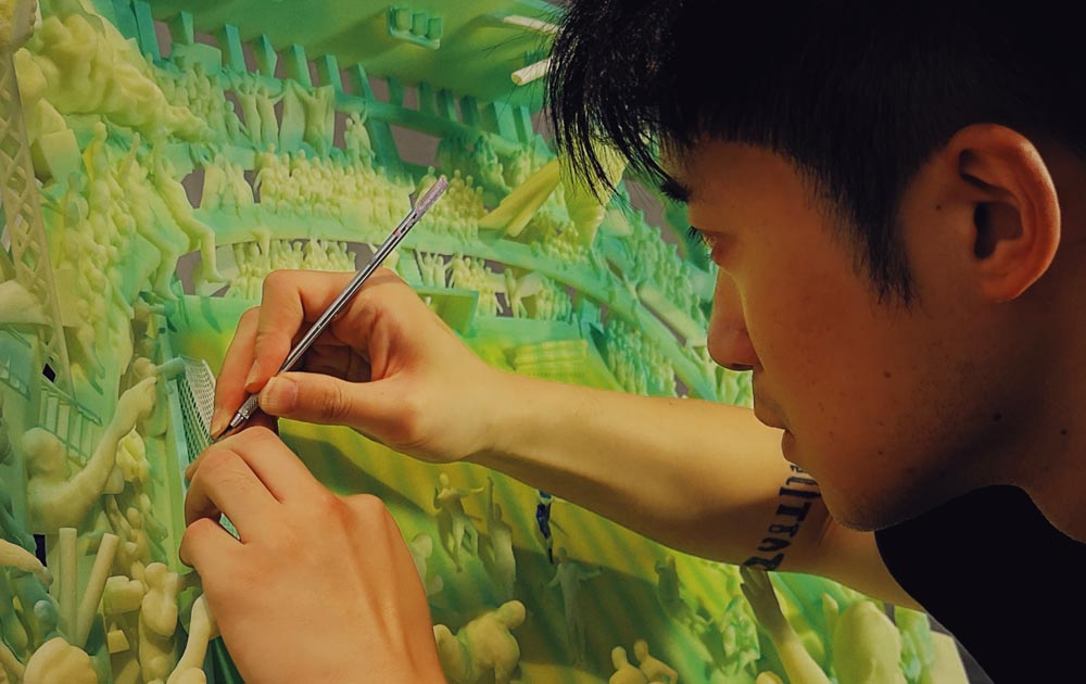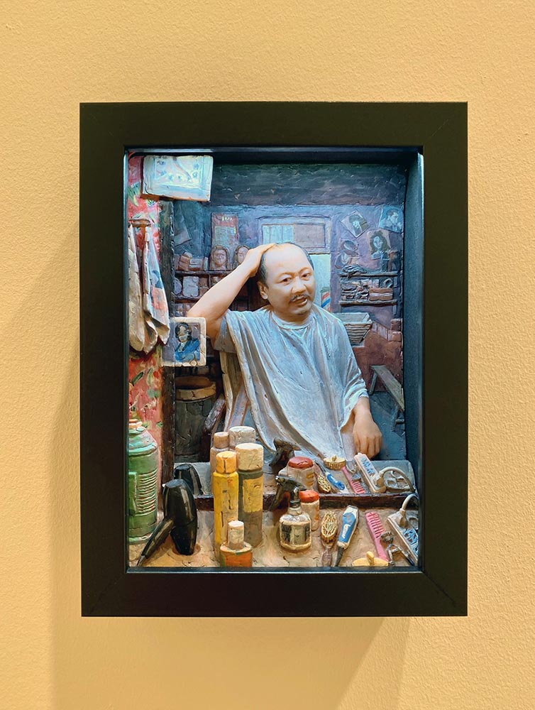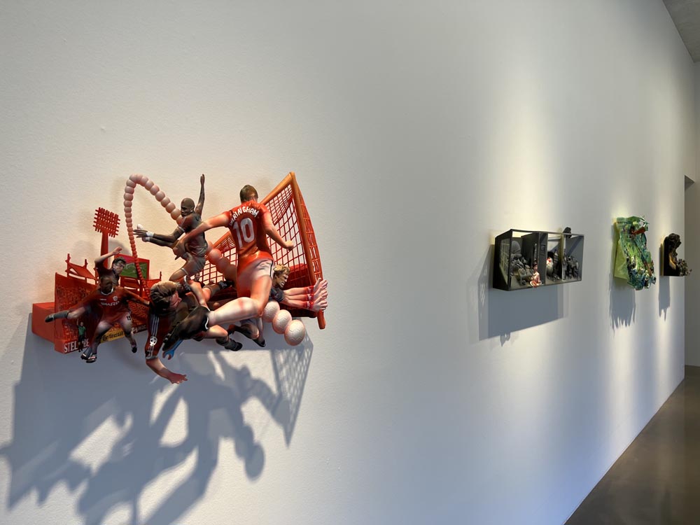 My ideas almost always start in the world. I’m constantly collecting raw material—images from TV and news, sports broadcasts, exhibitions I visit, and everyday encounters or conversations. Back in the studio, I translate those fragments into staged relief scenes, compressing time and space the way a film frame does. The process is both sculptural and painterly: I build figures and architecture in layers, control depth like a stage set, and use color, lighting, and detail to guide how the viewer reads the story.
