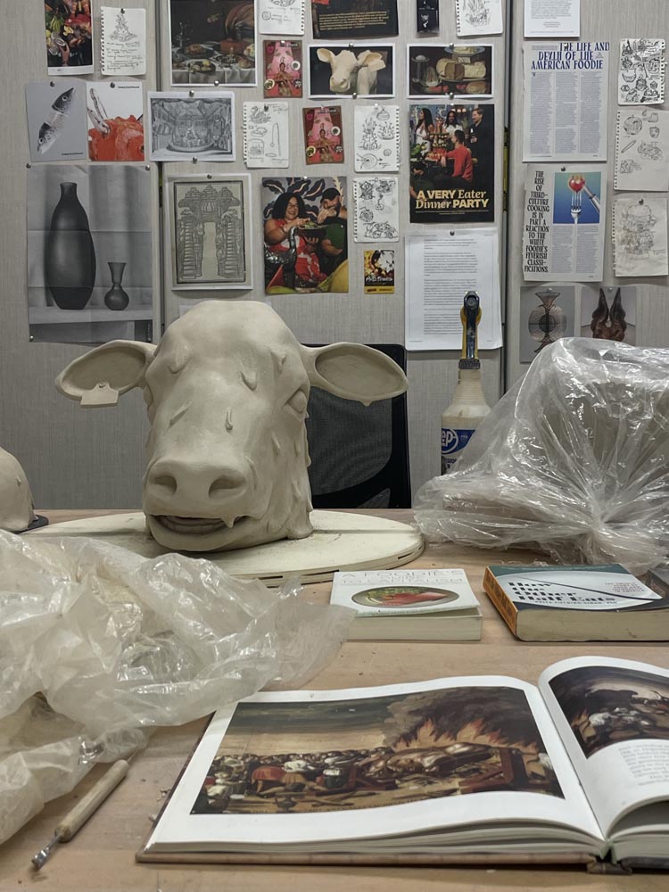 “My practice uses food as a visual language to dive into larger conversations of American socio-culture, politics, identity, religion, value systems, and so on. Ideas can start both in the world or in the studio. Clay requires patience. Building, drying, firing, glazing, firing, lustering, firing- it can be a while before you see a finished sculpture."