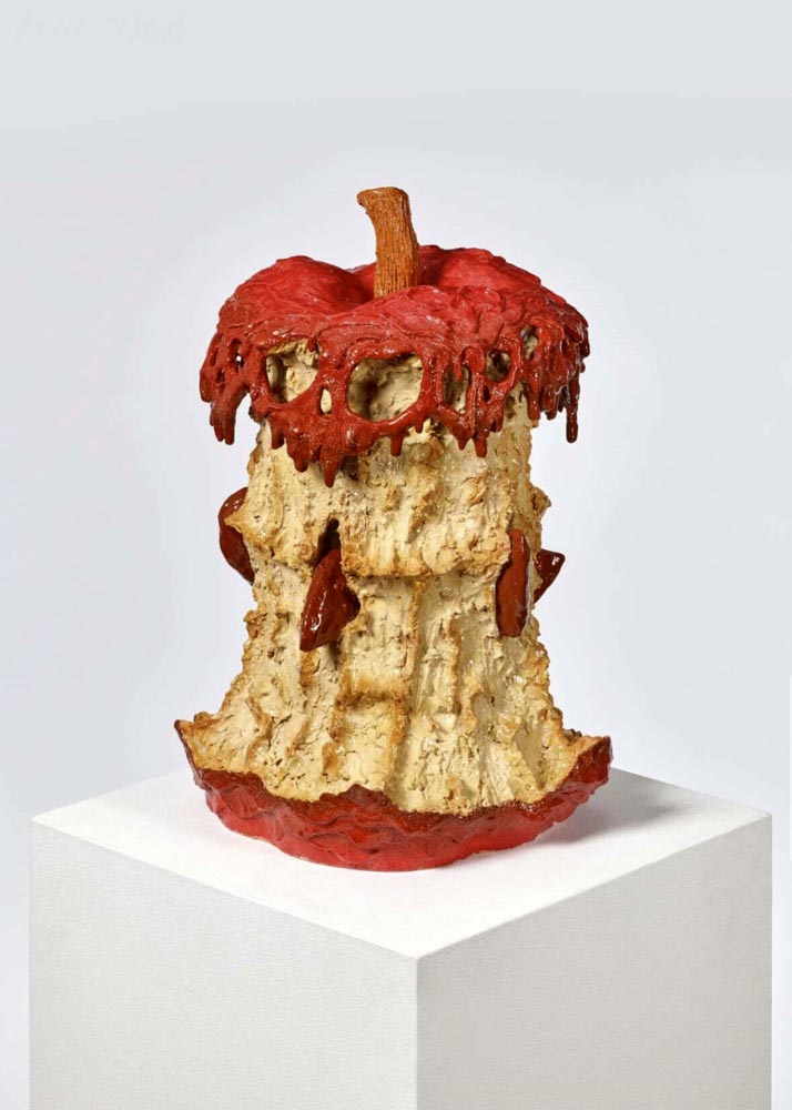 Bites of Glory. 2024. Ceramics, glaze, luster. 30 x 25 x 25 inches; removable Apple Sword, 30 x 5.5 x 3 inches.