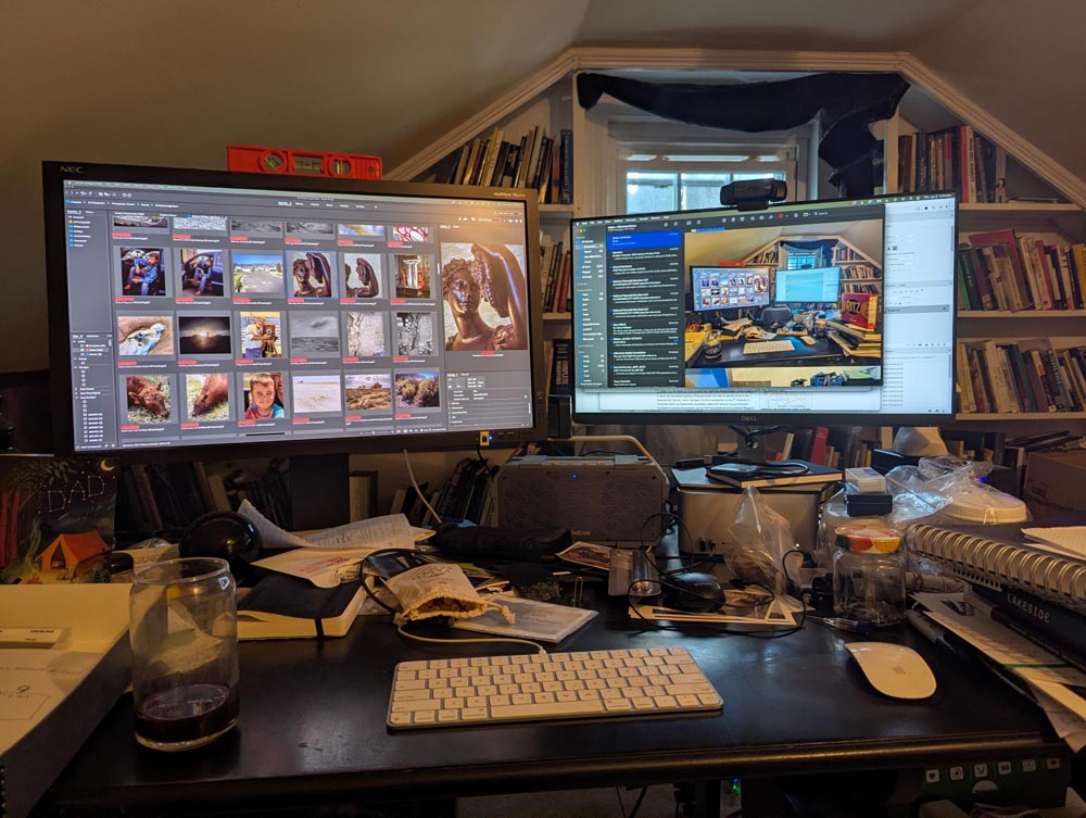 No eating in the studio ever. Gotta keep that separate. I only drink coffee or water up there. I may listen to music or I may not. Perhaps I’ll dig into a history or psychoanalysis or eastern religion podcast. I try to play those noisy things by ear. Sometimes I need quiet, other times melody, and still others a bit of narrative to straighten my thoughts.